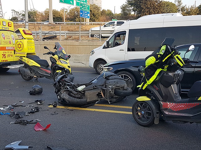 Днем 4 декабря на 20-й трассе в районе развязки Моше Даян столкнулись мотоцикл и автомобиль. В результате аварии тяжелые травмы получил мужчина примерно 25 лет, ехавший на мотоцикле.
