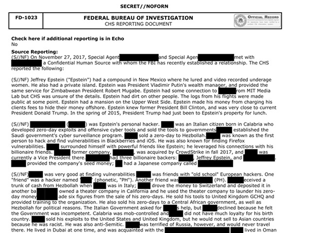В рассекреченном документе ФБР от 27 ноября 2017 года конфиденциальный источник утверждал, что Джеффри Эпштейн был управляющим состоянием президента России Владимира Путина.