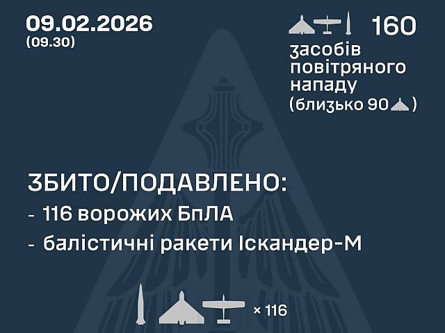 Генштаб ВСУ сообщает, что ночью 9 февраля 2026 года российские военные выпустили по Украине 11 баллистических ракет «Искандер-М» и 149 БПЛА-камикадзе и беспилотников других типов.