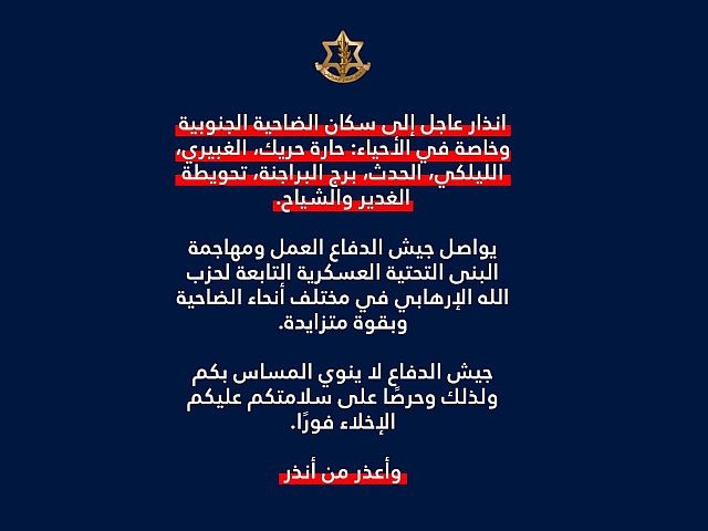 Пресс-служба ЦАХАЛа на арабском языке опубликовала срочное предупреждение для жителей южного пригорода Бейрута Дахии, являющегося оплотом шиитской террористической организации "Хизбалла".