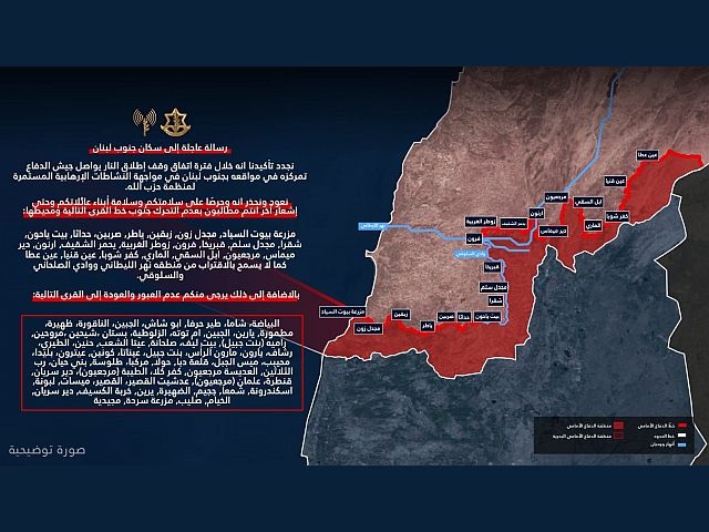 Пресс-служба Армии обороны Израиля на арабском языке опубликовала срочное предупреждение для жителей десятков населенных пунктов на юге Ливана.