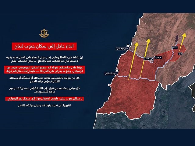 Пресс-служба ЦАХАЛа на арабском языке опубликовала срочное предупреждение для жителей юга Ливана, которые все еще находятся к югу от реки Захрани.