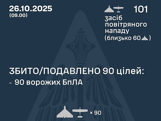 Генштаб ВСУ сообщает, что ночью 26 октября 2025 года российские военные выпустили по Украине 101 БПЛА-камикадзе «Shahed-136/131» («Герань-2/1») и беспилотников других типов.