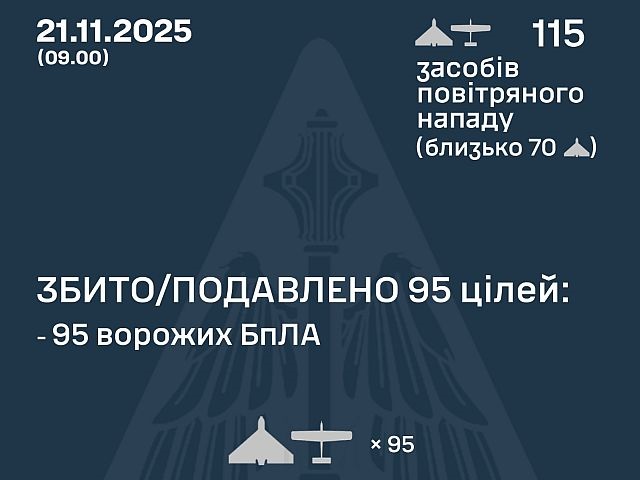 Генштаб ВСУ сообщает, что ночью 21 ноября 2025 года российские военные выпустили по Украине 115 БПЛА-камикадзе «Shahed-136/131» («Герань-2/1») и беспилотников других типов.