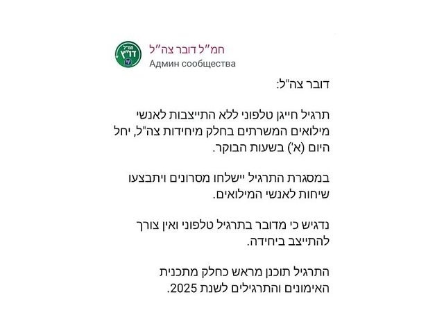 ЦАХАЛ предупреждает, что утром 23 ноября для резервистов некоторых подразделений Армии обороны Израиля начинаются учения по СМС-уведомлениям о призыве, также резервистам могут звонить из армии.