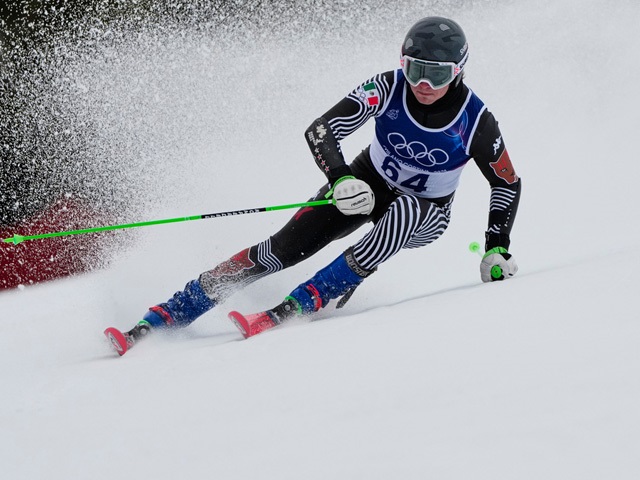 Проходит первый заезд в гигантском слаломе. В этих соревнованиях участвует израильский горнолыжник Барнабас Селлеш.